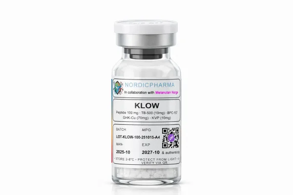 KLOW er et peptid-blend med BPC-157, TB-500, GHK-Cu og KPV. Det er utviklet for å gi en bredere profil på reparasjon og vevskvalitet,